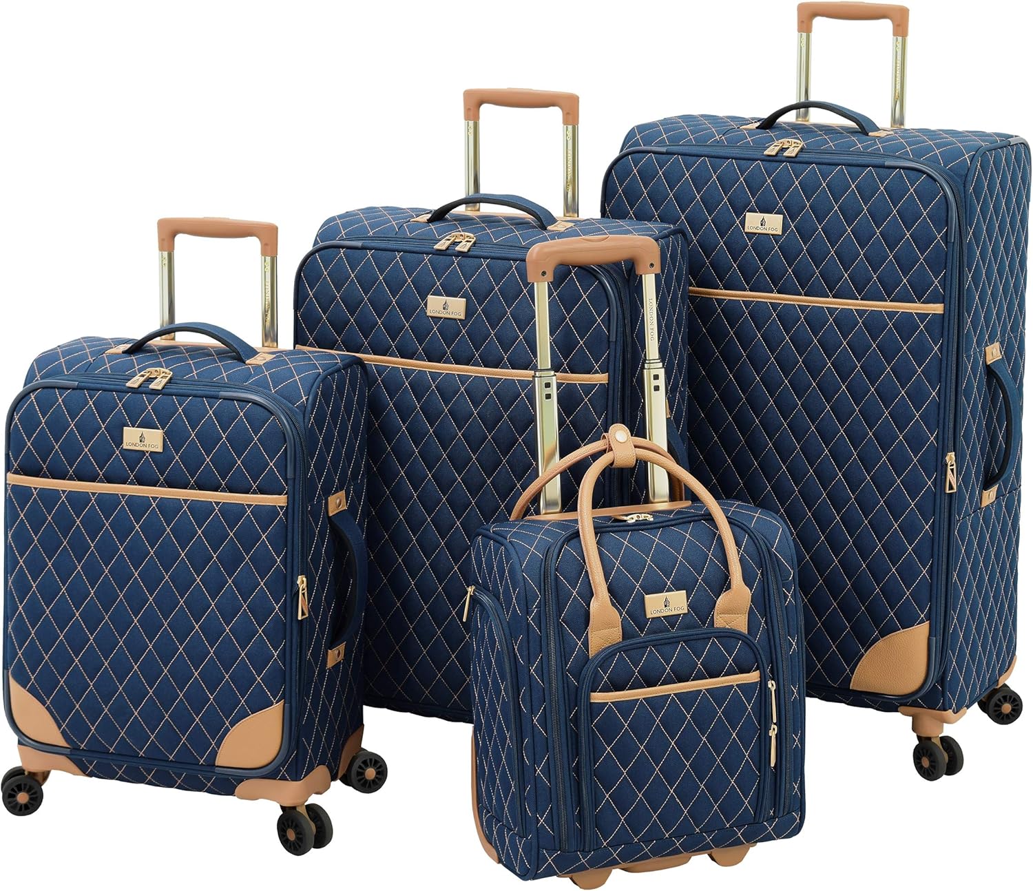 - Fashionable & durable stitched quilted polyester fabric. The queensbury 4 Piece Set Consists of a 20″ Expandable spinner carry-on, 24″ Expandable spinner, 28″ Expandable spinner and 15″ Vertical under the seat bag. Spinners have aluminum channel tubes for added strength and ergonomic comfort grip locking trolley handle.